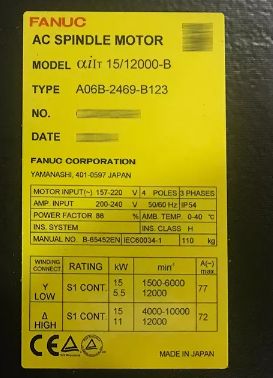 | Tên sản phẩm | A06B-2469-B123 A06B-1230-K469 # S0P Fanuc AC động cơ trục chính Mới ban đầu A06B-2469-B123 |